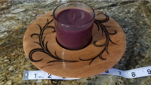 Solid cherry tea light holder with decorative Holiday engraving. A great Holiday accent piece.